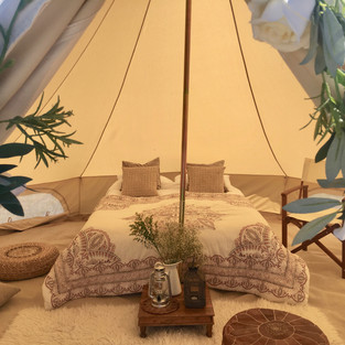 Luxury bell tent hire - what does that actually mean? Are you looking for a tent no matter what size, with a ground sheet and some airbeds with bedding, or are you looking for festival pop up hotel sized tents (5 metres) with all the trimmings ...and when we say trimmings we mean, beds off the floor, heavy zipped in ground sheets, fly screens, carpet or flooring throughout for insulation, bedding (not just a duvet with pillows) but with quilts and throws, beautiful furnishings with textured cushions and rugs, lanterns and fairy lights. Beauty is on the inside, not the outside - that's what we are all about! We want you & your guests to turn up to a lovely cosy haven for the weekend and never underestimate how pretty fairy lights look in tents too, we have these wrapped around the pole and within our lanterns to give a beautiful cosy glow. Our tents are incredibly spacious and filled with lots of lovely textiles and colour, to make your glamping weekend, an inviting and tranquil home from home!